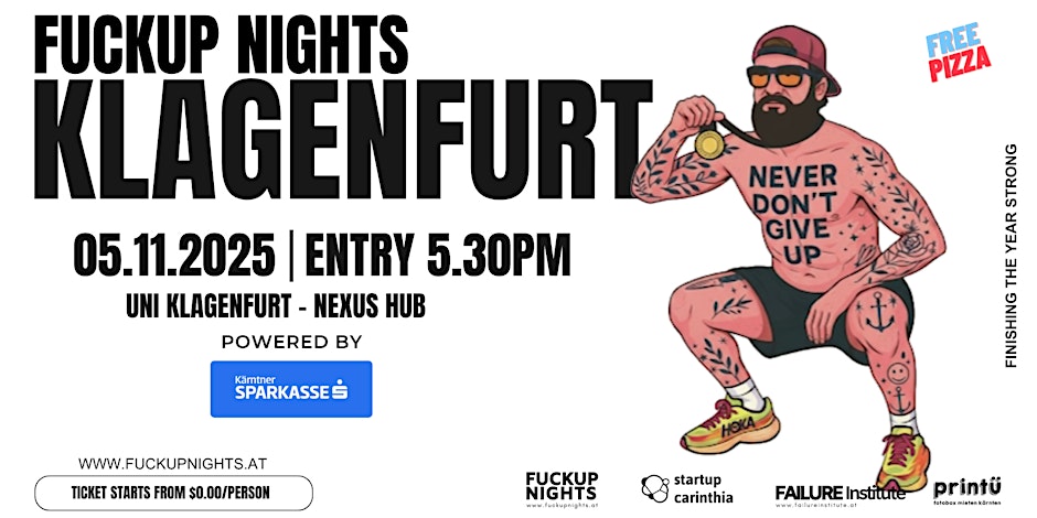 Business. Startups. Community. Growth: Sometimes we win. Sometimes we lose - and learn. Und feiern unsere größten Bauchflecken als das, was sie wirklich sind: die ehrlichsten Lehrmeister überhaupt. Fuckup Nights Kärnten Vol. 7 | powered by Kärntner Sparkasse