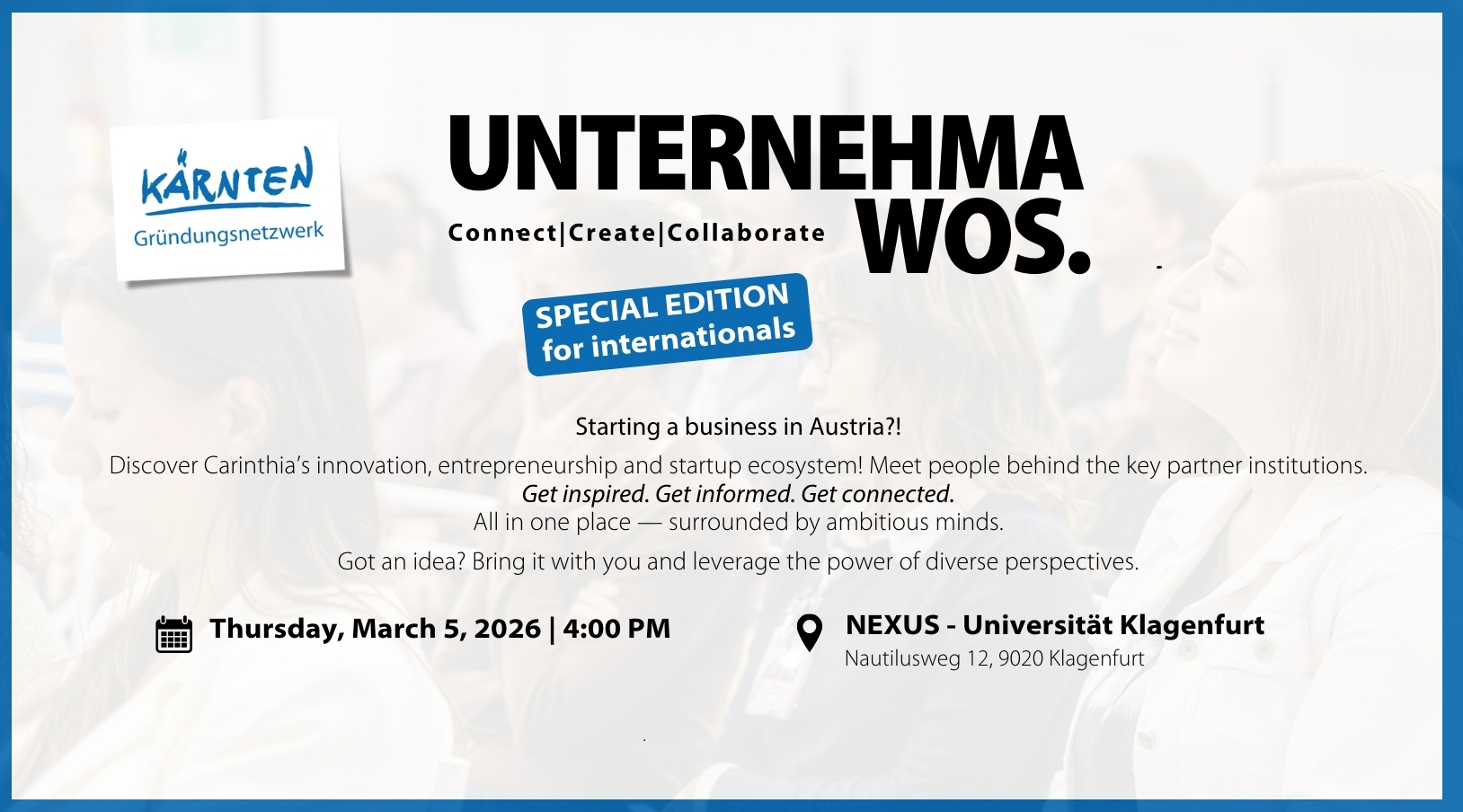 Die Eventreihe inspire! des Instituts für Innovationsmanagement und Unternehmensgründung (IUG) der Universität Klagenfurt bringt Menschen zusammen, die Zukunft gestalten wollen. Mit Speed-Networking, Kurzimpulsen und Open-Space-Formaten entsteht ein Raum, in dem neue Verbindungen, Chancen und Lösungen wachsen.